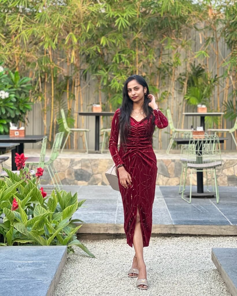 Celebrate your birthday in rich style with this stunning ruby red dress, a beautiful birthday outfit idea for women. The deep, luxurious color exudes sophistication, while the long sleeves offer an elegant touch.