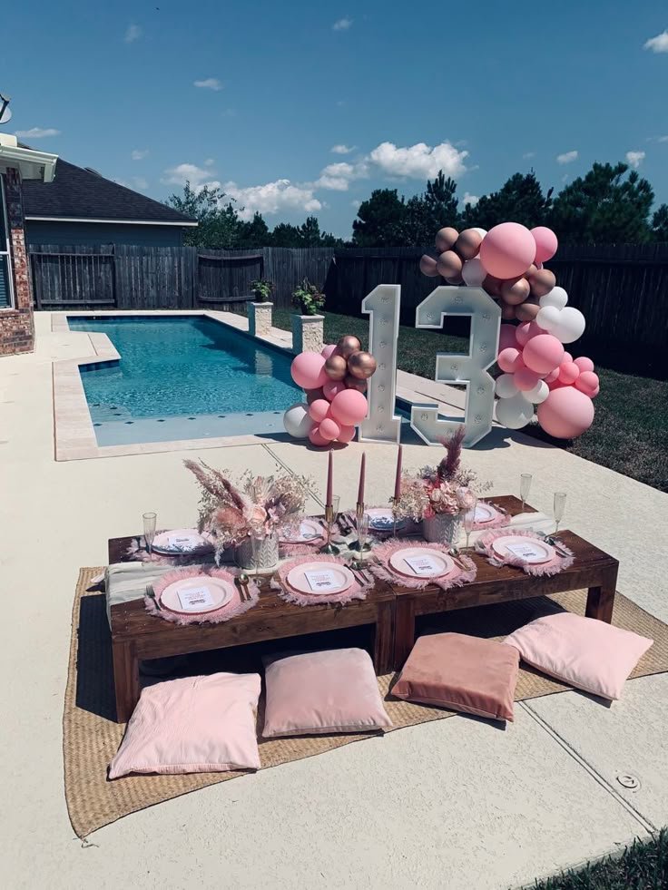 Illuminated “13” marquee lights alongside a lovely balloon cluster mark the special occasion. This chic poolside setup offers a unique and memorable way to celebrate a milestone.