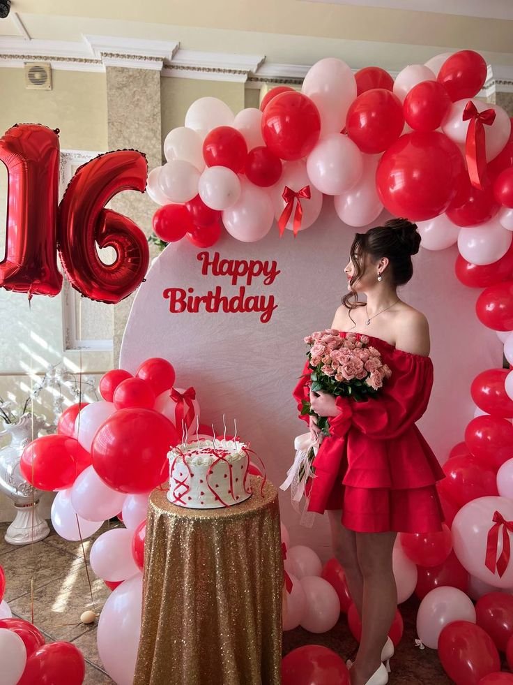 Celebrate sixteen with a dazzling red and white theme. A beautiful backdrop features a bright “Happy Birthday” script and a vibrant balloon arch in bold, festive colors.