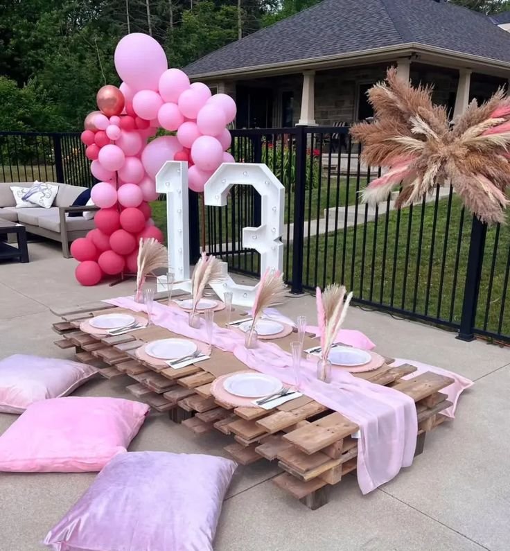 Celebrate your teenager’s birthday with an unforgettable outdoor lounge experience. This setup features a chic pallet table adorned with a soft pink runner, creating a stylish and relaxed atmosphere for birthday party ideas for teenagers.