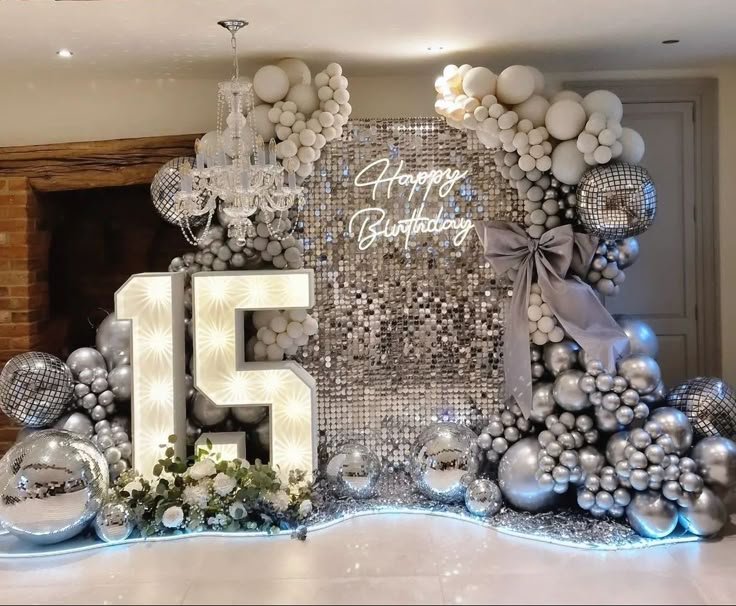 Elevate an 18th birthday celebration with a sleek, modern silver and black theme. A stunning balloon garland in varying metallic shades creates a striking visual impact, setting the stage for birthday party ideas for teenagers.