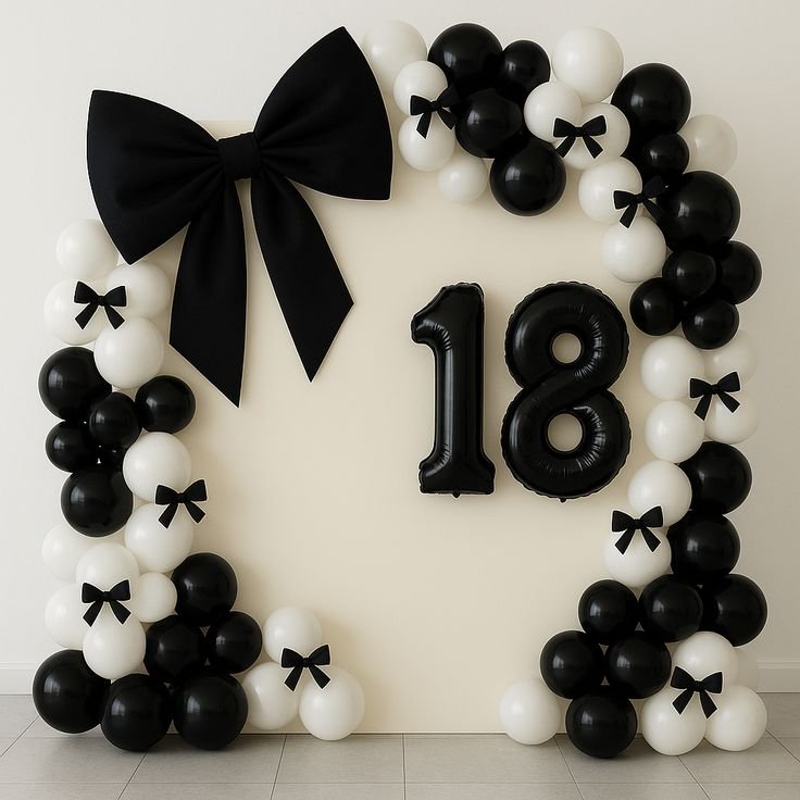 Celebrate an 18th birthday with classic style and charm. This sophisticated backdrop features a chic black and white balloon arch, adorned with delicate black bows, creating an elegant frame.