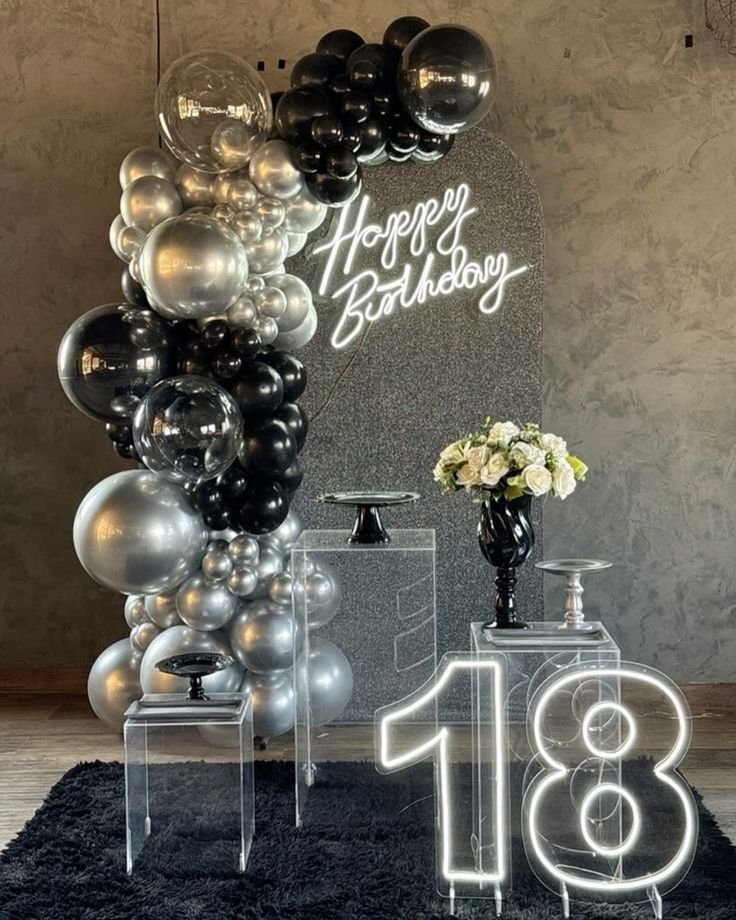 Celebrate eighteen with a sleek, sophisticated color scheme. A stylish balloon garland in black and varying silver tones creates a dramatic, modern backdrop for the event.