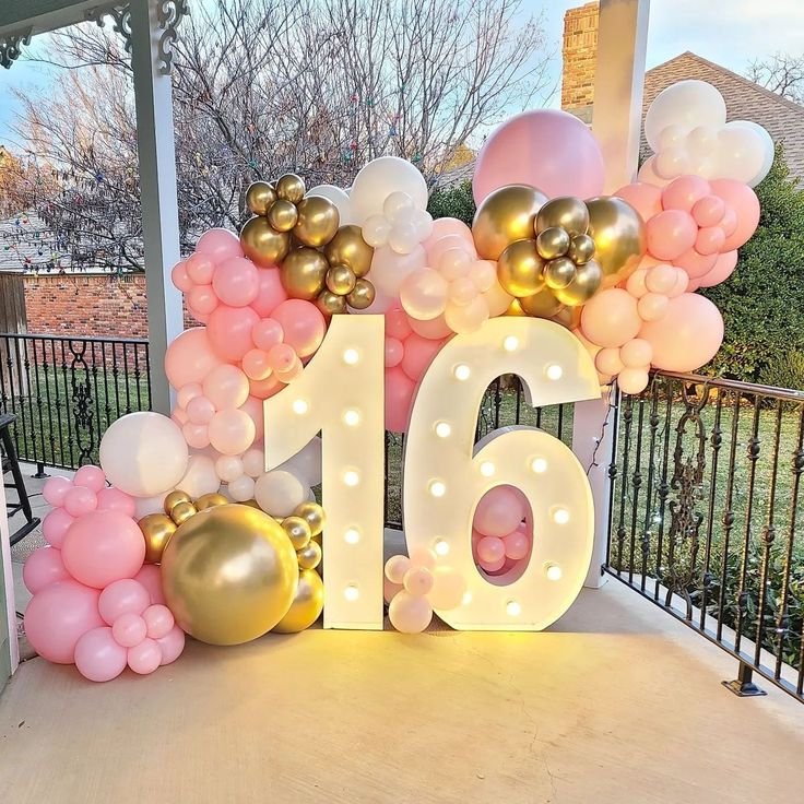 Mark a sweet sixteen with a luminous and stylish setup. A stunning garland of pink, white, and gold balloons creates a whimsical atmosphere, a fun option for celebrating teens.