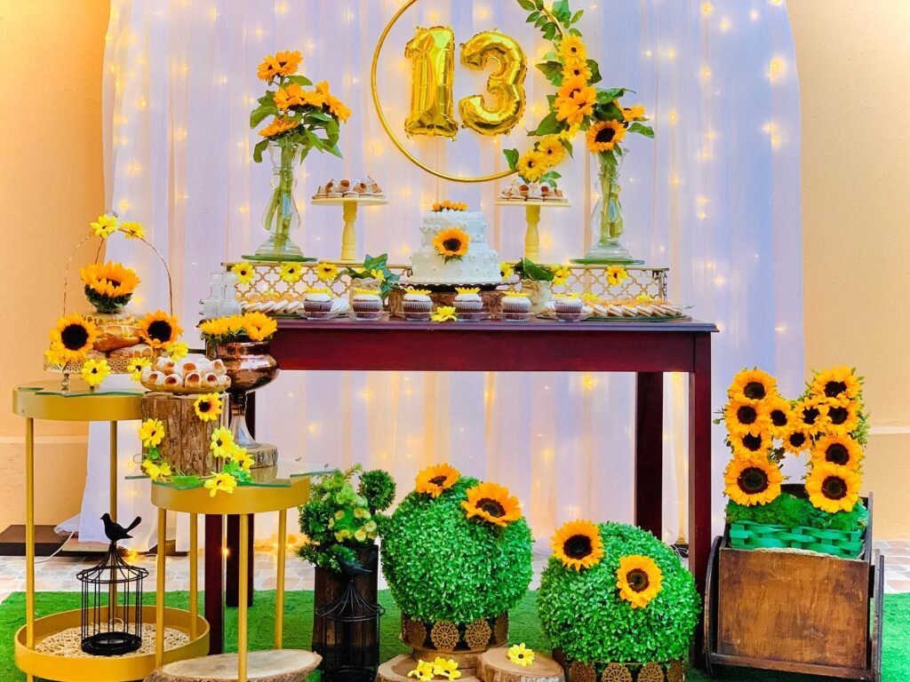 Celebrate a thirteenth birthday with a bright, charming sunflower theme. The vibrant yellow blooms create a cheerful and warm atmosphere, perfect for a happy celebration.