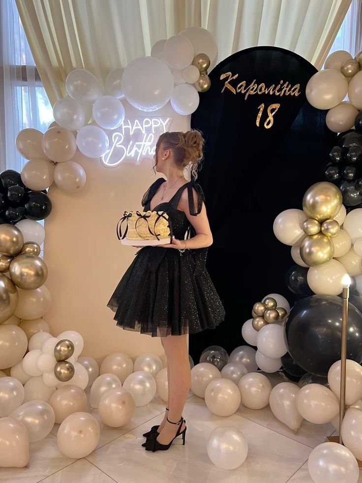 Mark an important milestone with a glamorous eighteenth birthday bash. This stylish scene, framed by elegant black, white, and gold balloons, sets a sophisticated tone for birthday party ideas for teenagers.