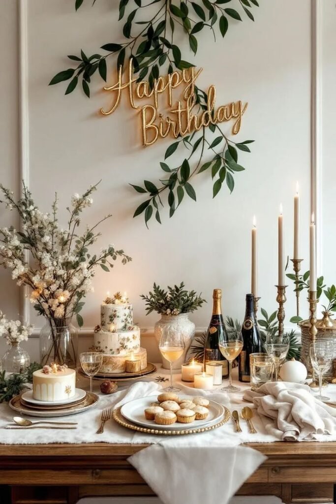 A golden “Happy Birthday” script sign is beautifully accented with natural greenery on the wall, creating a festive backdrop. The overall aesthetic is one of understated luxury and natural beauty, making it a charming choice for a memorable birthday dinner.