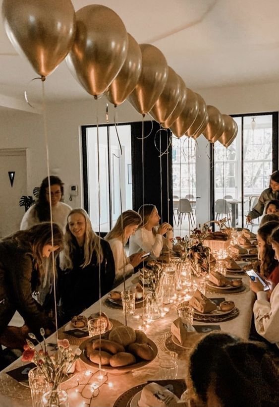Above, a row of shiny gold balloons floats, adding a festive and elegant touch to the room. The casual yet decorated setting makes this an appealing choice for a relaxed and memorable birthday dinner with friends and family.