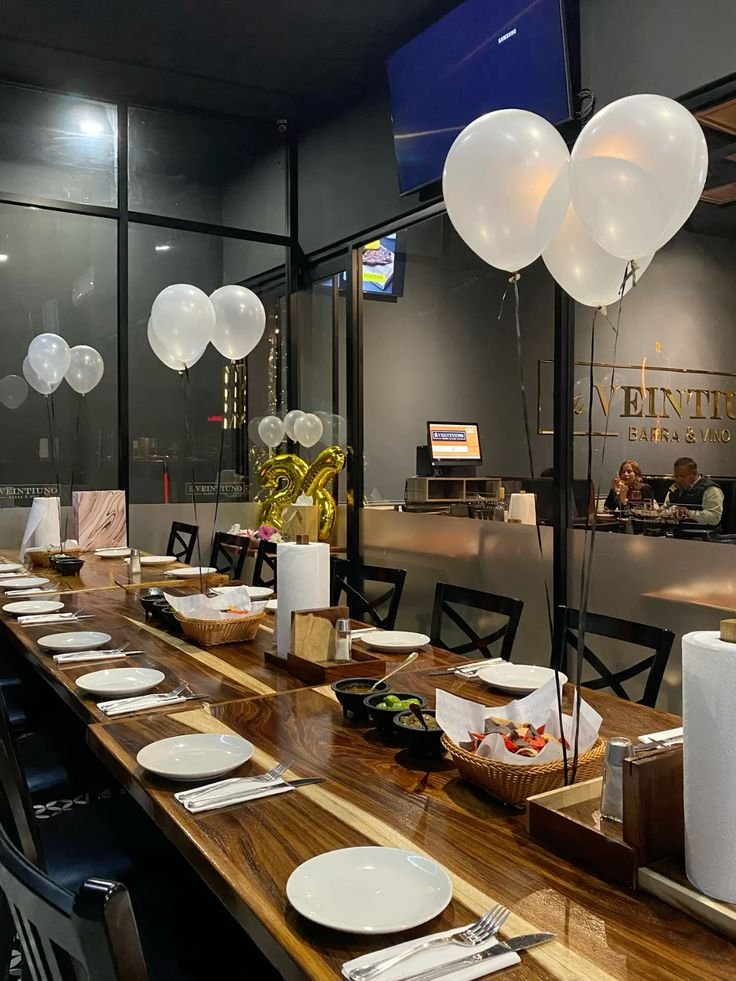 Floating above, an array of white balloons with long ribbons adds a festive and celebratory touch, contrasting beautifully with the rich tones of the room. This stylish venue provides a fantastic backdrop for a memorable birthday dinner.
