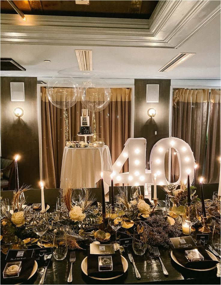 A grand, illuminated “40” sign serves as a brilliant focal point, celebrating a significant milestone. Nearby, a stylish tiered cake awaits, further emphasizing the celebratory mood. This entire setup creates an unforgettable birthday dinner, blending elegance with festive touches.