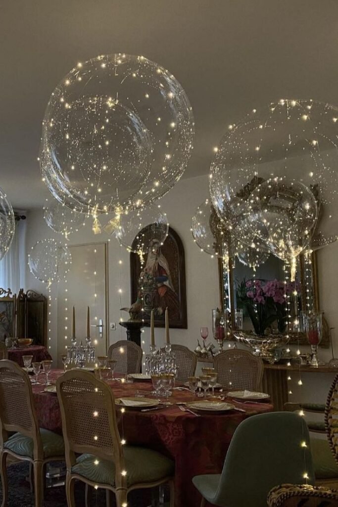 Above the table, large, clear balloons adorned with tiny, twinkling fairy lights create a breathtaking canopy, resembling a starry sky indoors. This whimsical touch elevates the celebration, making it an unforgettable birthday dinner experience for everyone.