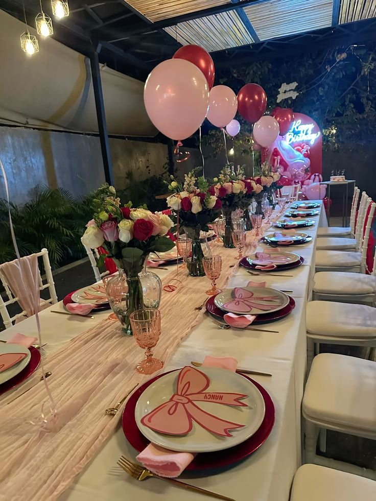 This charming birthday dinner setup features a long table beautifully draped in a white cloth, accented by a delicate pink ruffled runner. Each place setting boasts a bold red charger plate topped with a whimsical pink bow-shaped plate, adding a playful and personalized touch. Pink glassware complements the theme perfectly.