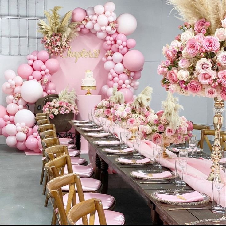 This delightful setup features a long wooden table adorned with a soft pink runner and complementary place settings, creating a cohesive and charming look. Each seat offers a comfortable pink cushion, inviting guests to relax and enjoy the festivities. The blend of rustic wood and delicate pink hues makes this a visually appealing birthday dinner.