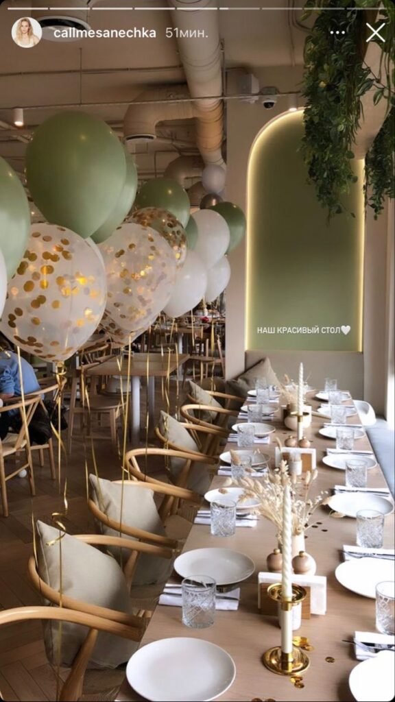 White balloons with long ribbons float gracefully, adding a festive touch and celebrating the occasion. A golden “24” balloon hints at a special milestone birthday. This clean and contemporary setting makes for a stylish and enjoyable birthday dinner experience.