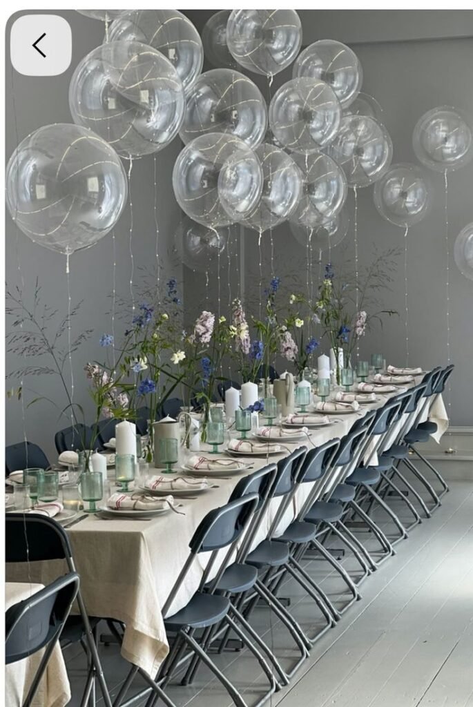 Above the table, numerous clear balloons filled with tiny fairy lights create a truly magical and whimsical effect. These illuminated spheres add a unique and enchanting element to the space, making it a truly memorable birthday dinner setting.