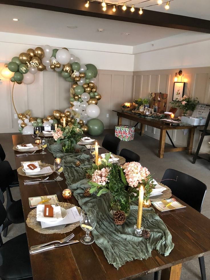 This charming birthday dinner setup features a long wooden table, beautifully adorned with a textured sage green runner. Each place setting includes elegant gold charger plates and thoughtful details, creating a refined yet welcoming atmosphere. The natural wood grain complements the earthy tones.