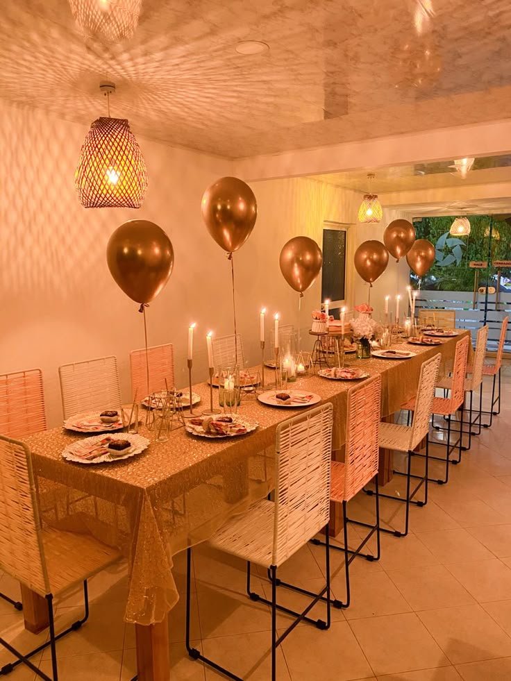 Above the table, a cascade of rose gold balloons and confetti adds a festive touch, creating a sense of joy and wonder. This cohesive and glamorous theme makes it a fantastic birthday dinner idea, promising an elegant and memorable celebration for all.