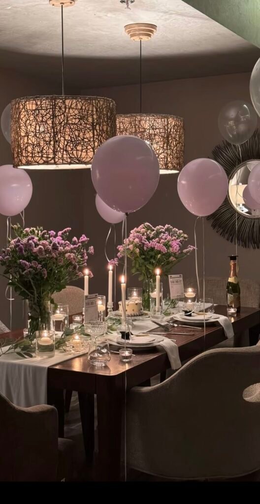 Soft pink balloons float gracefully above the table, adding a festive and whimsical element to the celebration. Rustic woven light fixtures overhead contribute to the cozy and inviting glow. This beautiful setup promises a truly memorable birthday dinner for all.