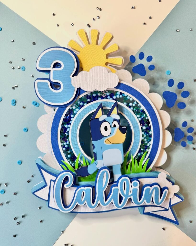 This stunning centerpiece features a personalized design with the number “3” prominently displayed alongside “Calvin” in elegant script lettering. The decoration showcases beloved Bluey characters surrounded by a sparkly sequined border that catches the light beautifully. Paw prints and small decorative elements are scattered around the design, creating a playful atmosphere.