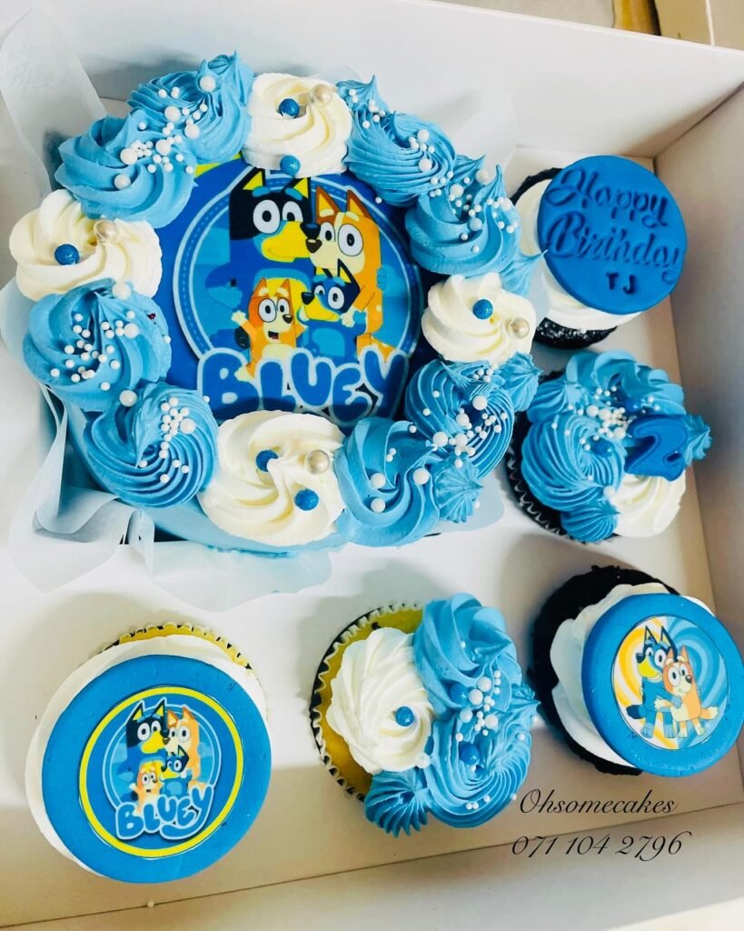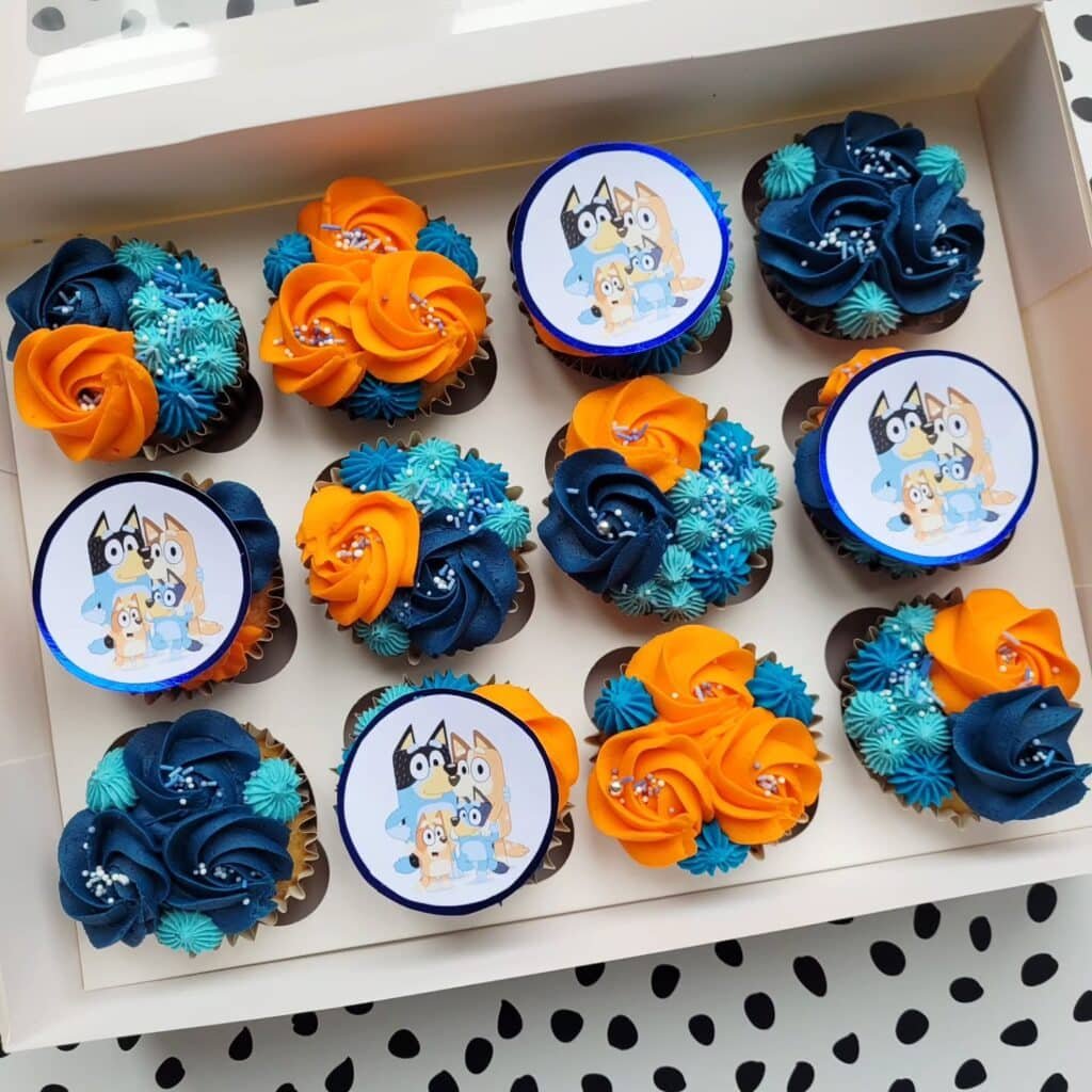 These professionally decorated cupcakes showcase the artistry possible with Bluey-themed desserts. Each cupcake features intricate buttercream work in the show’s signature colors, with some topped with edible character images. The blue and orange rosettes mirror the main characters’ coloring while creating an elegant dessert display.