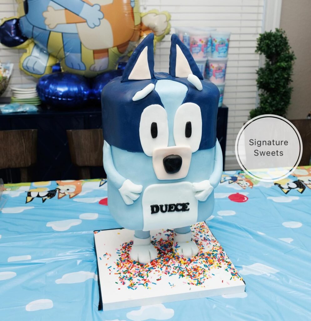 This impressive three-dimensional cake brings Bluey to life in edible form, featuring the character’s distinctive blue coloring and friendly expression. The cake includes fondant details that recreate Bluey’s ears, snout, and paws with remarkable accuracy. A small white banner reads “DUBBO,” personalizing this creation for the birthday celebrant.