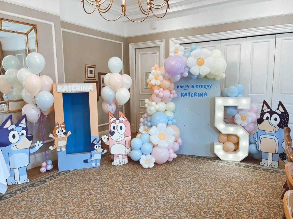 This comprehensive party room showcases multiple Bluey decorations working together to create an immersive celebration environment. Large character standees line the walls, while a custom “KATERINA” sign and number “5” balloon display mark this special birthday milestone. The balloon arrangements feature the signature blue color scheme with white and pastel accents.