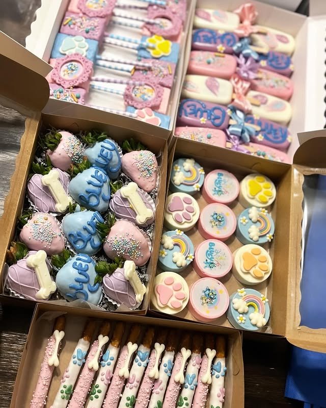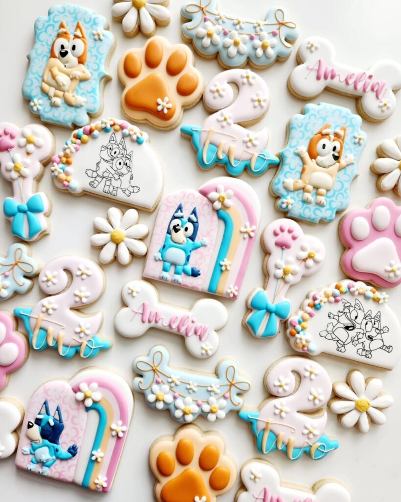 These intricately designed sugar cookies showcase the artistry possible with Bluey-themed treats. Each cookie tells a story through detailed royal icing work, featuring beloved characters like Bluey and Bingo in their signature colors. The collection includes themed shapes like paw prints, bones, rainbows, and floral elements that capture the show’s joyful spirit.
