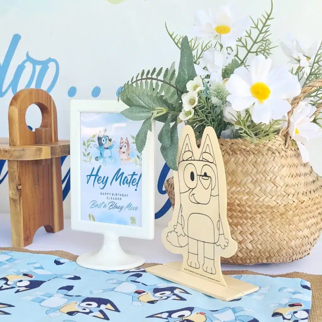 This charming display combines several Bluey elements into a cohesive keepsake area that guests can enjoy throughout the party. The wooden character cutout provides an interactive element, while the framed artwork adds a personalized touch to the celebration. Fresh flowers in a woven basket bring natural beauty to the themed setup.