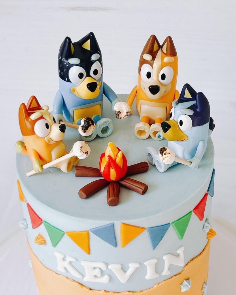 This stunning fondant cake showcases the entire Heeler family gathered around a campfire, capturing one of the show’s recurring themes of family togetherness. The detailed character work demonstrates professional cake artistry, with each family member accurately represented in their distinctive colors and expressions. The camping scene adds narrative depth to the dessert centerpiece.