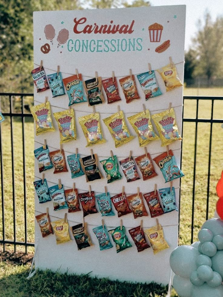 This clever snack wall is a fantastic and practical idea for any carnival birthday party. A large white board, labeled “Carnival Concessions” with playful graphics of popcorn and hotdogs, serves as the display. Individual bags of popular snacks are neatly clipped to horizontal strings, making them easily accessible.