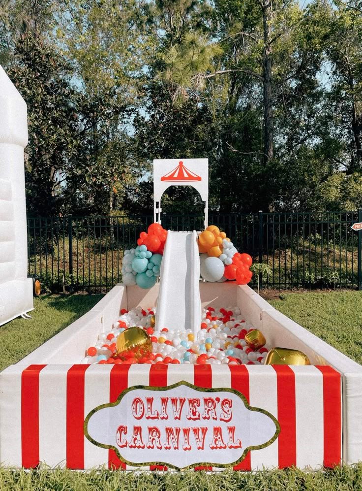 This exciting ball pit is a fantastic addition to any carnival birthday party, promising hours of entertainment. The exterior features classic red and white stripes, immediately setting a festive tone. A prominent sign proudly announces “Oliver’s Carnival,” personalizing the fun zone.