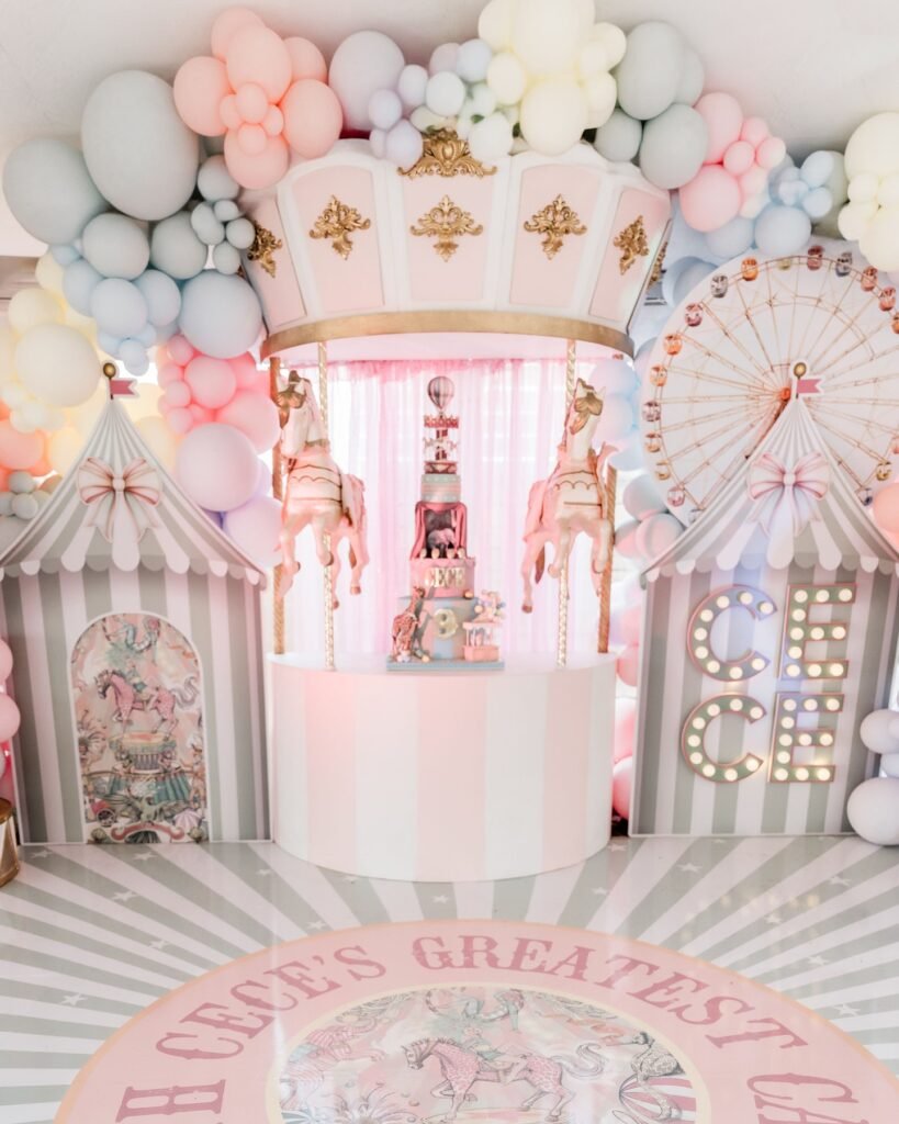 This breathtaking setup redefines a carnival birthday party with its whimsical elegance. A grand carousel centerpiece, featuring two detailed horses, serves as the main attraction. Pastel balloons in soft pinks, blues, and yellows create a dreamy cloud overhead, enhancing the magical atmosphere.