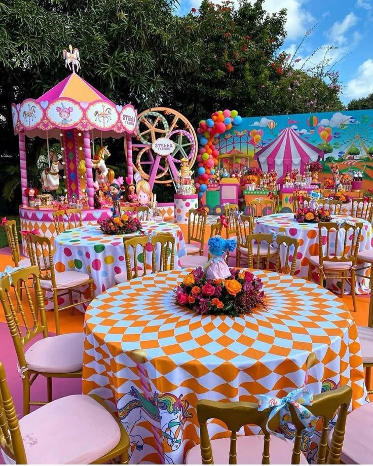This vibrant outdoor setting creates an explosion of color and joy for a carnival birthday party. Round tables with playful orange checkered and polka-dot tablecloths are arranged with golden chairs, inviting guests to sit and enjoy. Each table features a beautiful floral centerpiece, adding elegance.