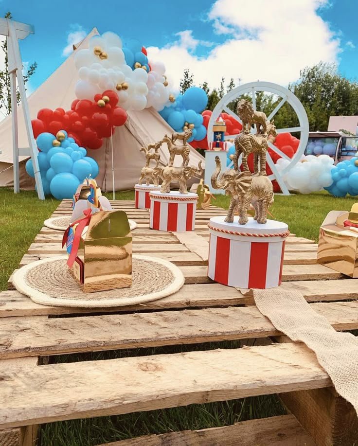 This outdoor setup beautifully captures the spirit of a carnival birthday party with a touch of golden elegance. A rustic wooden pallet table is adorned with charming red and white striped pedestals. Each pedestal proudly displays a shimmering gold animal figurine, creating a sense of a grand circus act.