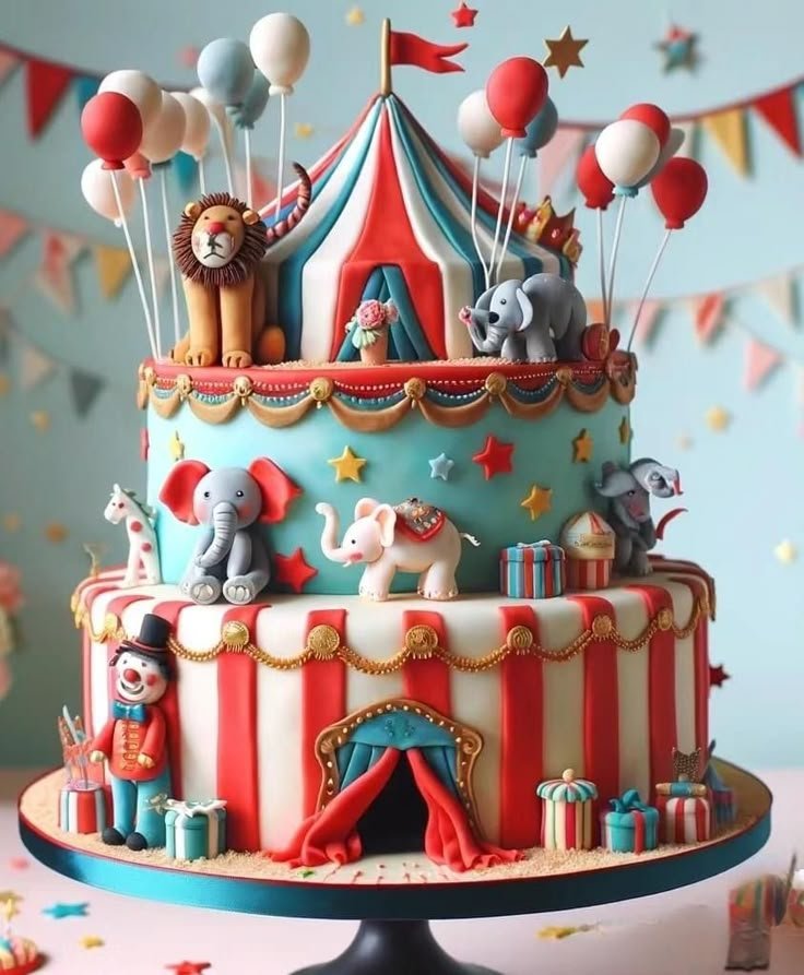 This multi-tiered cake is a masterpiece, bringing all the charm of a carnival to life for a birthday party. A vibrant red, white, and blue big top crowns the cake, complete with a tiny flag. Around it, adorable animal figurines, including a majestic lion and a playful elephant, add a whimsical touch.