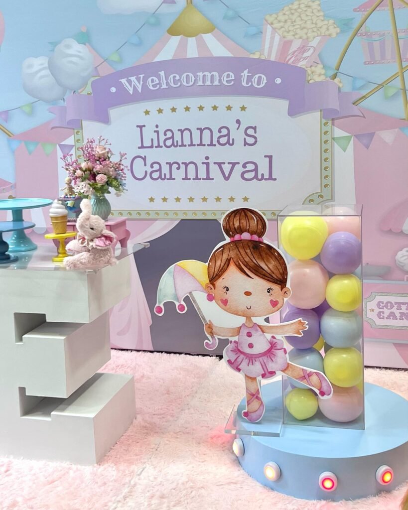 The scene perfectly blends the fun of a carnival with a delicate, girly aesthetic. It creates a magical entrance and photo opportunity, ensuring Lianna’s carnival birthday party is a truly delightful and memorable occasion for everyone.