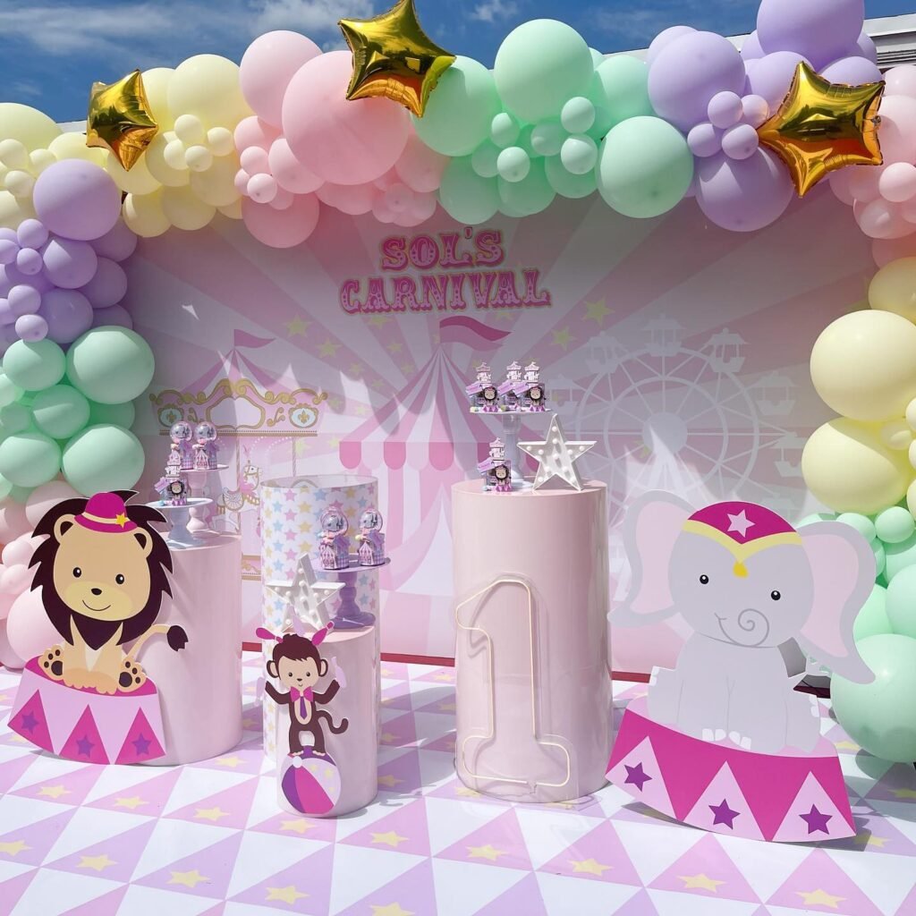 This delightful scene sets the stage for an unforgettable carnival birthday party. A pastel balloon arch, adorned with shimmering gold stars, frames a charming backdrop. The soft hues of pink, mint, lavender, and yellow create a whimsical atmosphere, drawing guests into the festive spirit.