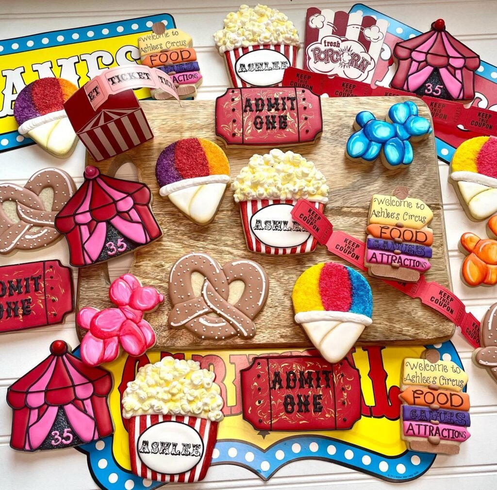“Admit One” tickets add an authentic touch, alongside colorful snow cones. Even balloon animals are recreated in edible form, adding a playful element. Some cookies also feature welcoming signs, personalized for “Ashlee’s Circus,” creating a cohesive and inviting display.