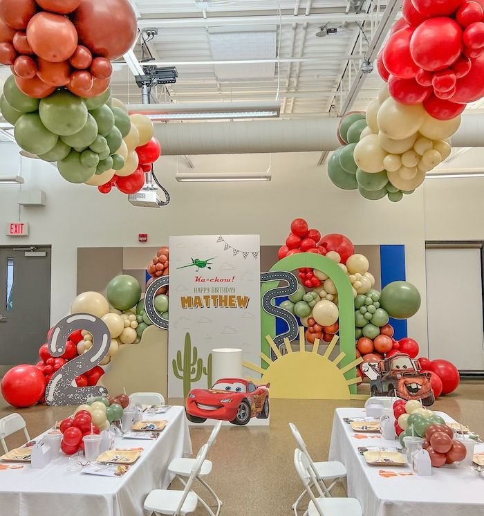 Transform your party space into a vibrant Radiator Springs scene with an eye catching Cars movie themed birthday setup. Colorful balloon garlands in red, green, and cream mimic the desert landscape, creating a festive atmosphere. Large character cutouts of Lightning McQueen and Mater instantly welcome guests into the exciting world of Cars.