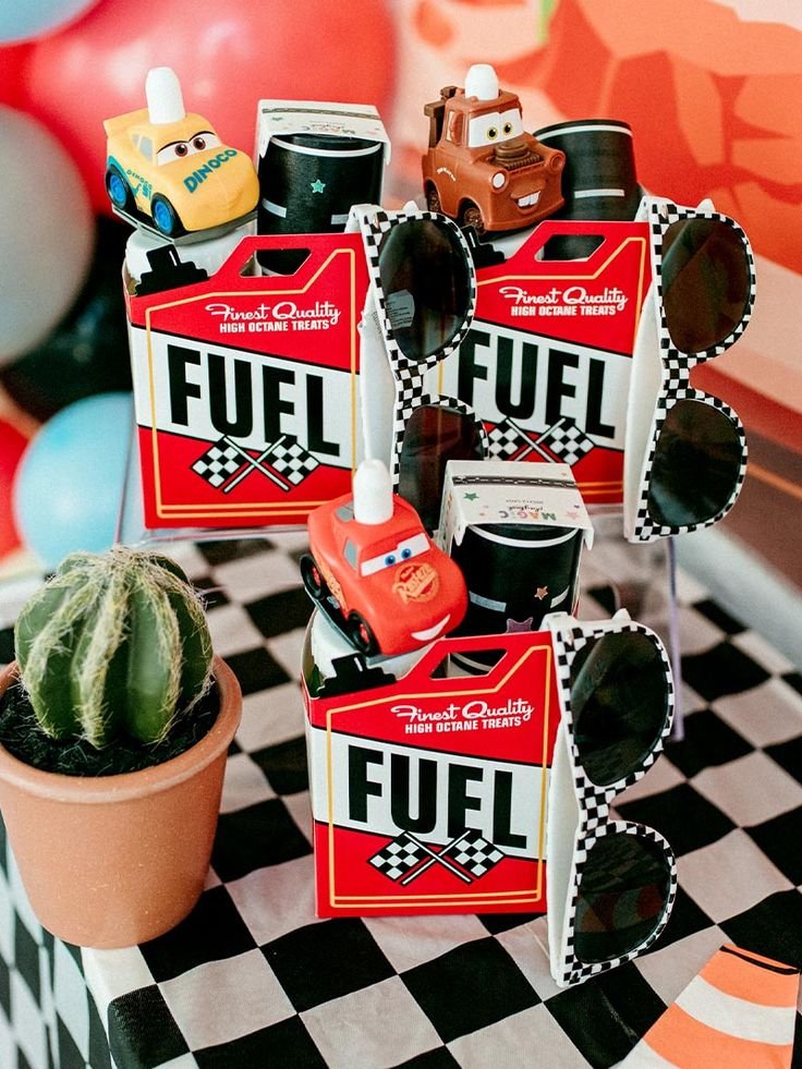 Send guests home with exciting mementos from a Cars movie themed birthday with these creative party favors. Each “FUEL” box, designed to resemble a gas can, is filled with “high octane treats” and serves as a clever container for goodies. Checkered sunglasses are tucked in, providing a stylish accessory for little racers.