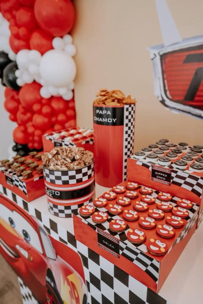 The clever use of checkered patterns and bold reds creates a cohesive and exciting look for this Cars movie themed birthday. It provides both delicious snacks and an additional decorative element, ensuring every detail contributes to a memorable and fun filled celebration.