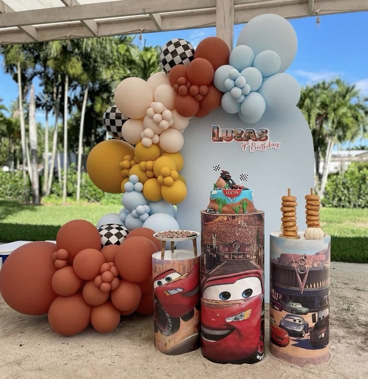 Create an exciting outdoor setting for a Cars movie themed birthday with this fantastic display for Lucas’s 4th celebration. A light blue arched backdrop, personalized with “Lucas 4th Birthday,” anchors the scene. Balloon garlands in a warm palette of terracotta, light blue, cream, and checkered accents frame the area, adding a festive touch.