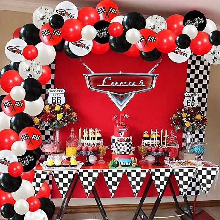 Transform your party space into a winner’s circle with this vibrant Cars movie themed birthday setup for Lucas. A striking red backdrop proudly displays a personalized “Lucas” Cars logo, setting the stage for celebration. An impressive balloon arch in red, black, and white, adorned with checkered flag and car themed designs, frames the entire display.