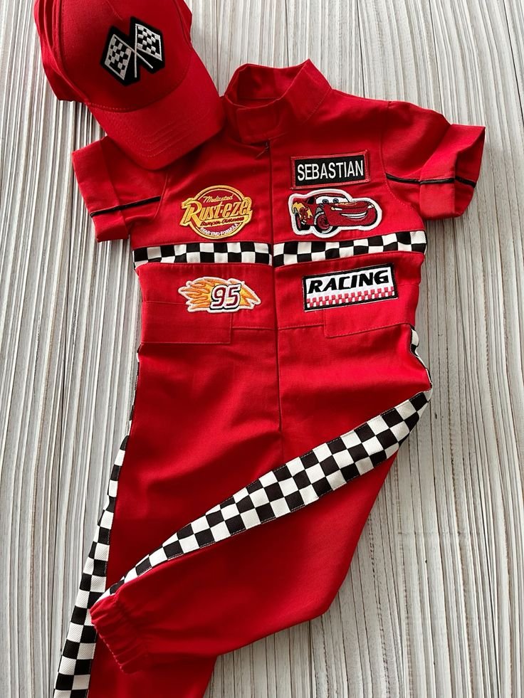 Dress your little one in championship style with this adorable racing jumpsuit, perfect for a Cars movie themed birthday. The vibrant red jumpsuit, complete with authentic patches like the Rust-eze logo and Lightning McQueen’s number 95, transforms any child into a miniature race car driver. A matching red cap with checkered flags completes this winning ensemble.