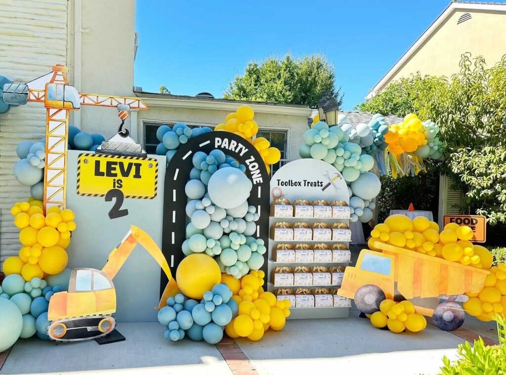 This stunning construction themed birthday party setup transforms any backyard into a vibrant work site wonderland. Bold yellow and blue balloons create dramatic focal points around cardboard construction vehicles and road signs. The towering crane backdrop anchors the scene while “LEVI is 2” signage adds personal flair to this construction birthday celebration.