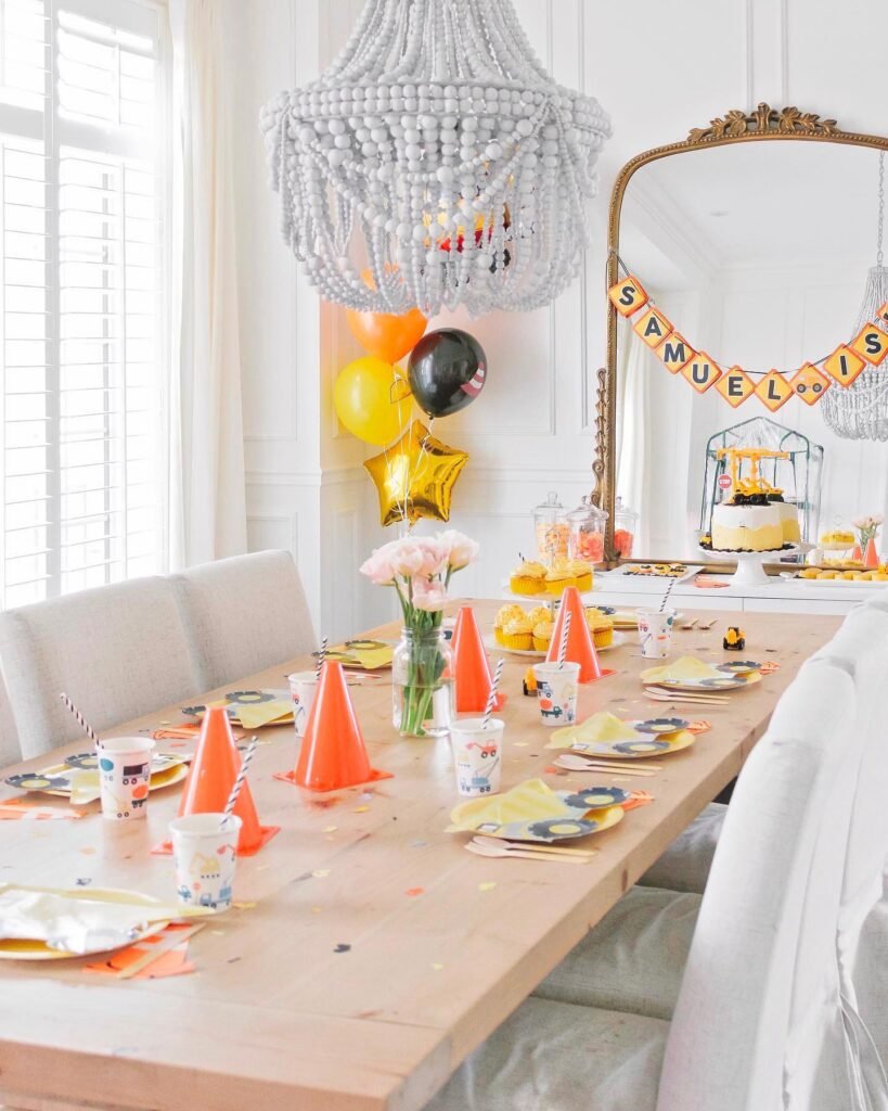 Construction themed birthday party celebrations benefit from this balanced approach that combines authentic construction elements with sophisticated dining presentation. The neutral wood table and white chairs allow themed accessories to shine while creating a celebration space that appeals to both children and adults.