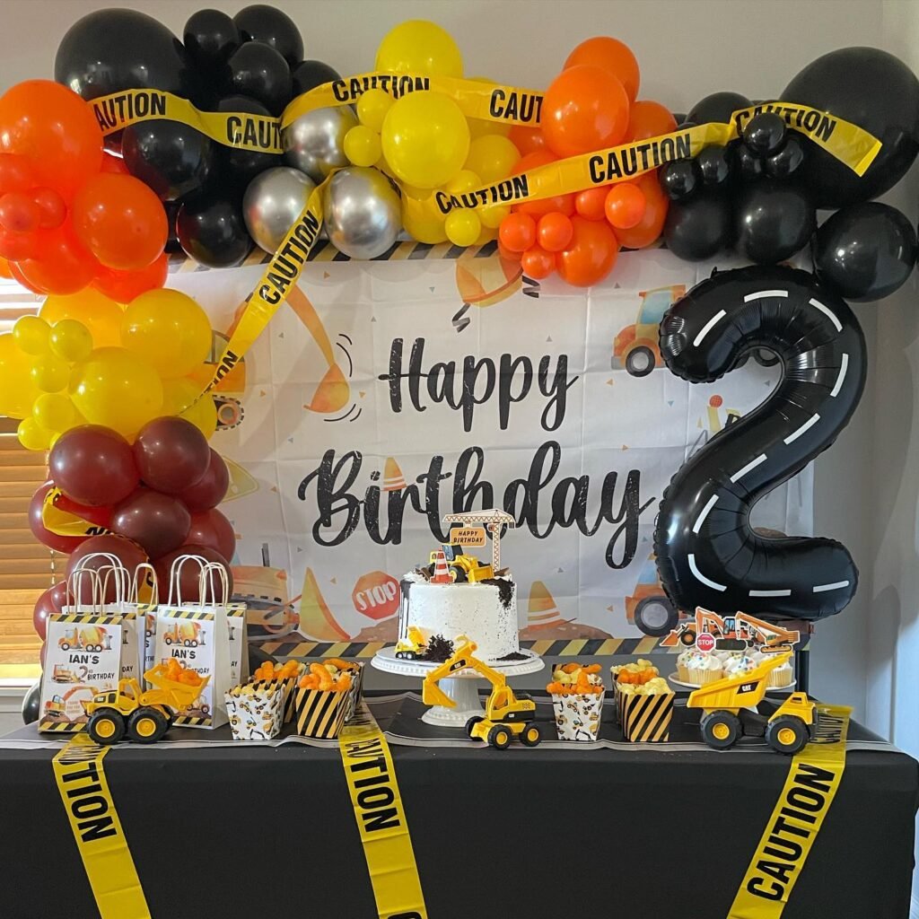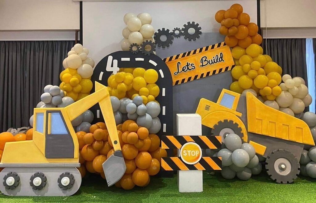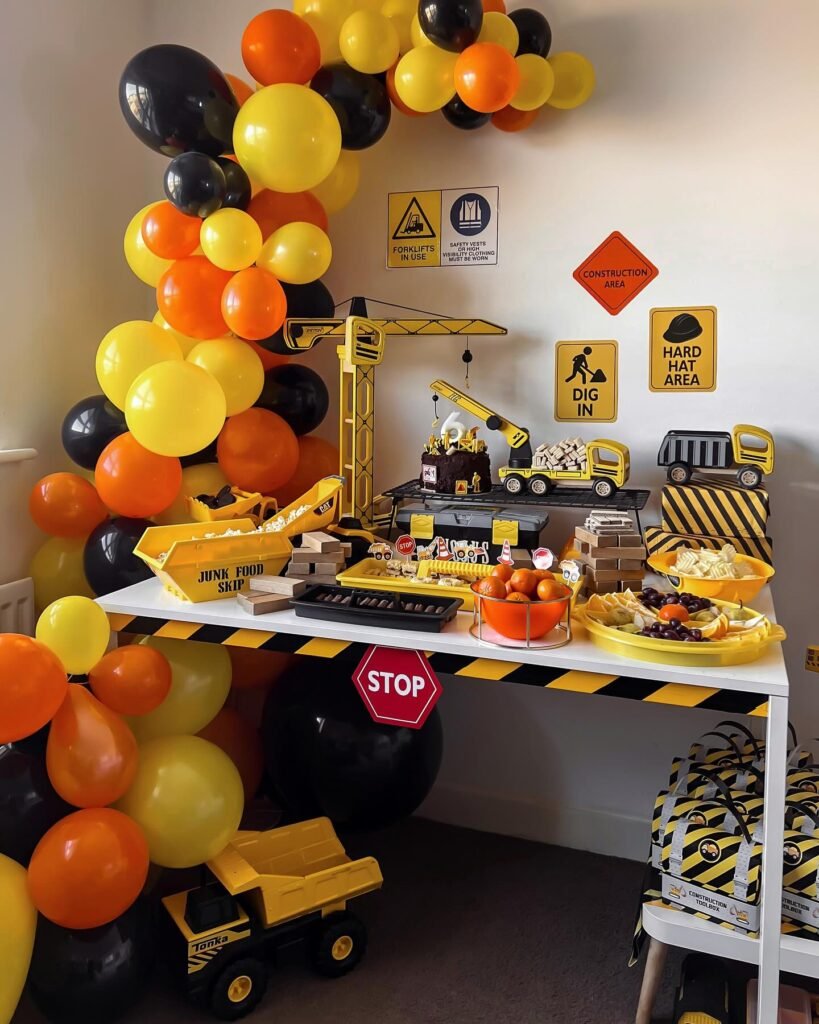 This construction themed birthday party idea works brilliantly for venues with large windows, as natural light makes the balloon colors pop. The towering display serves as both decoration and entertainment, giving kids plenty to admire while adults snap photos of this memorable celebration.