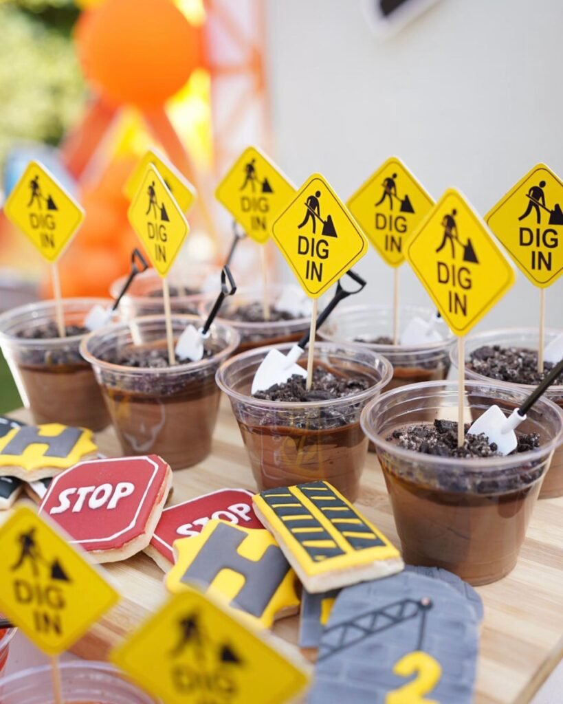 These clever dirt cake pudding cups transform ordinary desserts into a captivating construction site experience. Each clear plastic cup layers chocolate pudding with crushed Oreo “dirt” and features authentic yellow construction signs reading “DIG IN” that double as both decoration and invitation to eat.
