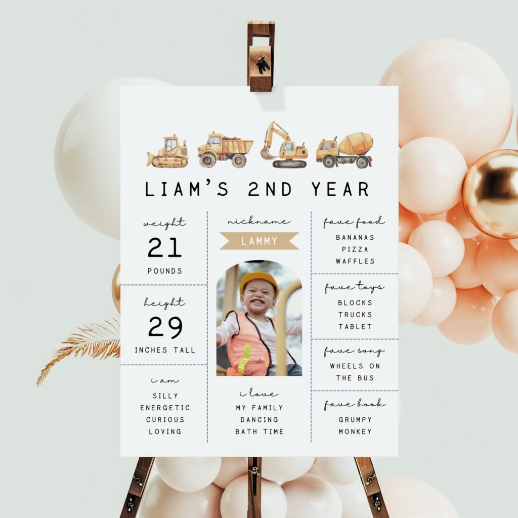 This adorable milestone board showcases Liam’s second year achievements through a charming construction vehicle theme. Four watercolor construction trucks crown the display while personal details fill organized sections below, creating a memorable keepsake that doubles as party decoration.