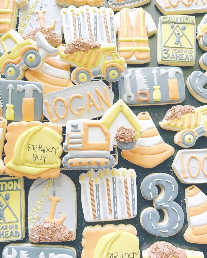 This stunning array of construction themed sugar cookies transforms Logan’s third birthday into an edible work site masterpiece. Each cookie showcases incredible detail, from dump trucks loaded with chocolate “dirt” crumbs to authentic caution signs and personalized hard hats reading “Birthday Boy.”